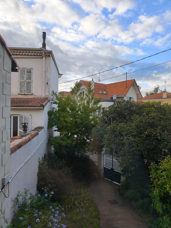 Der Blick aus dem Fenster. Man beachte die blauen Blumen unten links, Plumbago der botanische Name. In Südfrankreich ist es ganzjährig grün und es blüht auch immer was.