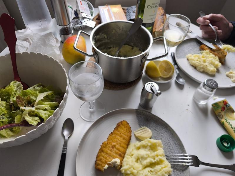 Ansonsten gibts paniertes Fischfilet, selbstgemachter Kartoffelstampf und grünen Salat.