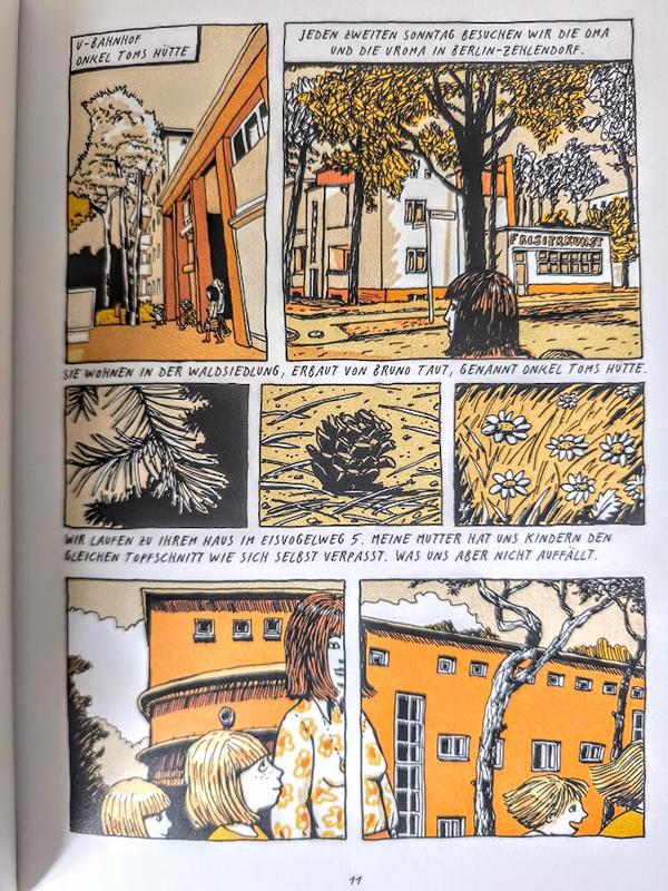 Die Autorin/Zeichnerin nimmt uns mit auf eine Reise durch ihre Familiengeschichte, die von den Anfängen des Nationalsozialismus bis in die 68er Jahre reicht und rund um ein Haus im Berliner Viertel namens „Onkel Toms Hütte” spielt. Die Siedlung wurde, weshalb mich die Geschichte auch angesprochen hat, ebenso wie die “Hufeisensiedlung” von Bruno Taut erbaut. Bianca Schaalburg versucht herauszufinden, was ihr Großvater während des Kriegs in Riga gemacht hat. Und hat sich die Familie seinerzeit ein Haus angeeignet, das Juden gehört hat?